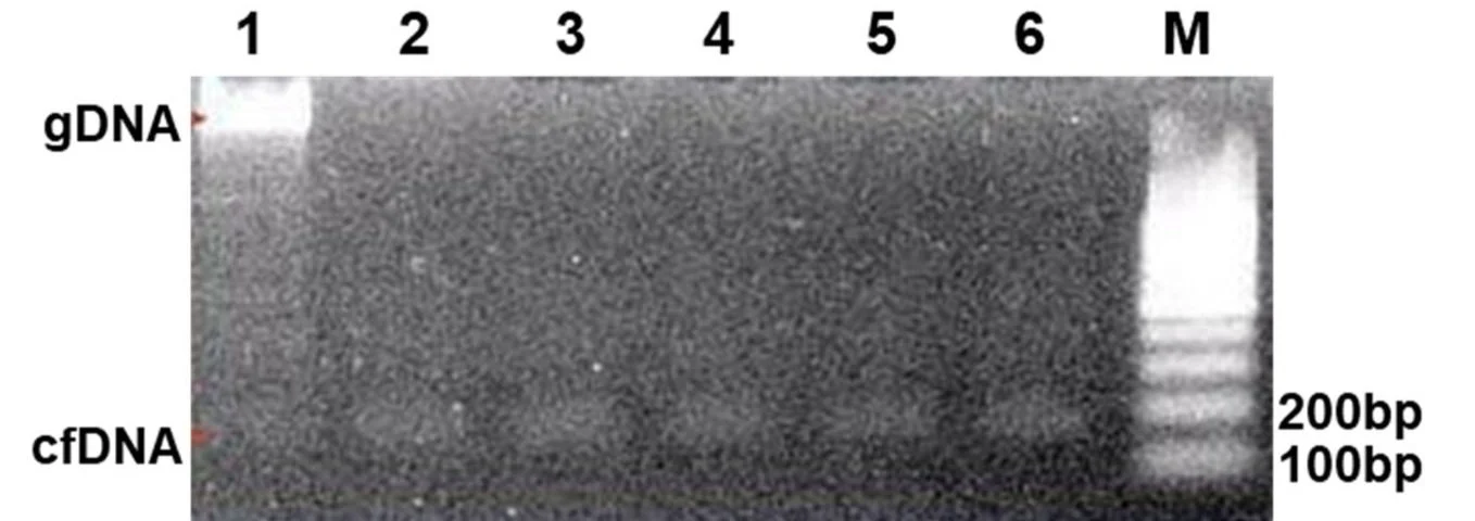 Lane 1 is from Q company. Lanes 2-6 are from this company. Large-sized gDNA and cf-DNA are shown on the left side